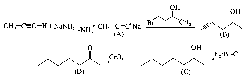 Terminal alkyne reacts sodamide to produce sodium salt of alkyne by elimination of ammonia molecule. Sodium salt of alkyne reacts with alkyl halide by nucleophilic substitution reaction mechanism. Secondary alcohol is oxidised by to produce ketone.