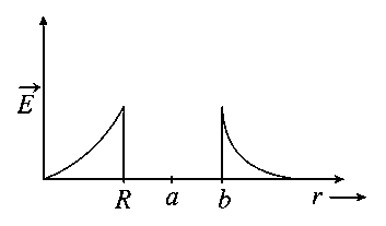 A solid metal sphere of radius having charge is enclosed inside the concentric spherical shell of inner radius and outer radius as shown in the figure. The approximate variation electric field , as a function of distance , from centre , is given by: