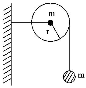 As shown in the figure, a bob of massis tied to a massless string whose other end portion is wound on a fly wheel (disc) of radiusand massWhen released from rest the bob starts falling vertically. When it has covered a distance ofthe angular speed of the wheel will be: