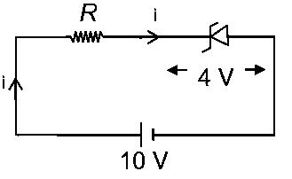 A Zener diode with a breakdown voltage ofis connected in series with a resistanceto a battery of emf. The maximum power dissipation rating for the Zener diode is. The value ofto ensure maximum power dissipation across the diode is