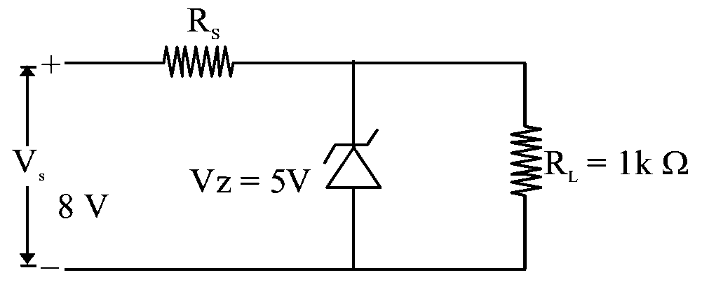 In the given circuit if the power rating of Zener diode is , the value of series resistance to regulate the input unregulated supply is: